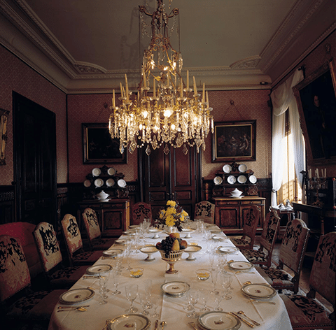 Explorez les différentes pièces du château et découvrez leur atmosphère luxueuse. De la salle à manger avec son service de famille armorié et sa magnifique gobeleterie en cristal, à la cuisine qui expose une batterie de casseroles en cuivre étincelantes, en passant par la chambre à repasser où trône une authentique calandreuse en bois, et la chambre des marquises où reposent encore des jupons de dentelles et des robes de bals, chaque pièce dévoile une histoire au charme unique.